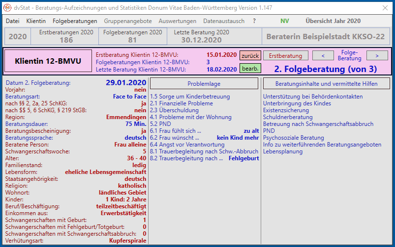 Jede einzelne Beratung wird nach der Eingabe oder Änderung am Bildschirm in einer knappen Zusammenfassung angezeigt. Am Bildschirm sieht das am Beispiel einer 2. Folgeberatung so aus: