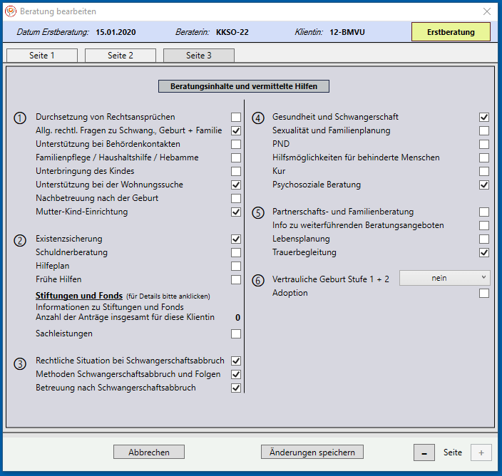Auf Seite 3 wird festgehalten, um was es bei dieser konkreten Beratung ging, welche Themen angesprochen wurden, welche Hilfen für die Klientin gegeben werden konnten.